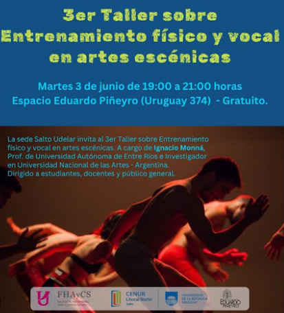 Este martes 3 de junio a las 19:00 horas en el Espacio Cultural Eduardo Piñeyro, se llevará a cabo el Tercer Taller sobre Entrenamiento físico y vocal en artes escénicas, por el programa de actividades Culturales de la sede Salto Udelar. El mismo es abierto y de carácter gratuito. El programa de actividades Culturales de la sede Salto Udelar invita al tercer encuentro del Taller sobre Entrenamiento fisico y vocal en artes escénicas. A cargo de Ignacio Monná, Prof. de Universidad Autónoma de Entre Rios e Investigador en Universidad Nacional de las Artes – Argentina. Esta actividad está dirigida a estudiantes, docentes y público general interesado en la temática. Se enmarca en el intercambio y cooperación con la sede Concordia de la Universidad Autónoma de Entre Ríos (UADER) y cuenta con el apoyo del Espacio Cultural Eduardo Piñeyro de la Intendencia de Salto.