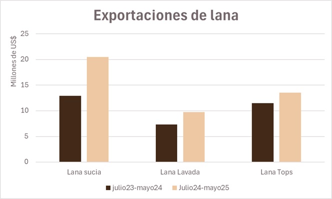 El crecimiento se explica por el mayor dinamismo de las colocaciones en todas las presentaciones del producto -lana sucia, lavada y tops-, aunque con mayor participación de las primeras dos categorías. En el caso de la lana sucia, las exportaciones sumaron 20,5 millones de kilos, con ingresos por US$ 62,5 millones, lo que representa un incremento del 58% en volumen y del 84% en facturación frente al mismo período del ciclo anterior.