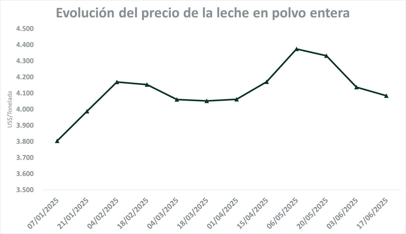 El valor promedio para la leche en polvo entera (LPE) fue de US$ 4.084 por tonelada en esta licitación y marcó una baja del 2,1% respecto a la venta anterior (US$/ton 53). Los contratos de LPE a futuro cerraron con descensos en todas las posiciones, entre julio y noviembre de 2025. Los negocios de agosto y setiembre, que son los de mayor volumen comercializado, se posicionaron en US$ 4.189 por tonelada y US$ 4.059, con bajas del 2,5% y 2% respectivamente.