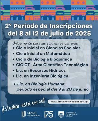 El Departamento de Enseñanza del Cenur Litoral Norte de la Universidad de la República informa el segundo período de ingreso a la Udelar en el segundo semestre, para las sedes de Salto y Paysandú. Las inscripciones se realizarán del 08 al 12 de julio, la MODALIDAD será en formato virtual a través del Sistema de Gestión Administrativa de la Enseñanza (SGAE). Los ingresos son sin previas, adjuntar la F69A o constancia de egreso de UTU. Más información en: www.unorte.edu.uy. Las inscripciones para la Licenciatura en Biología Humana tiene un período especial del 9 al 20 de junio. Web: http://www.lbh.fmed.edu.uy/ Consultas: lbh.interior@gmail.com