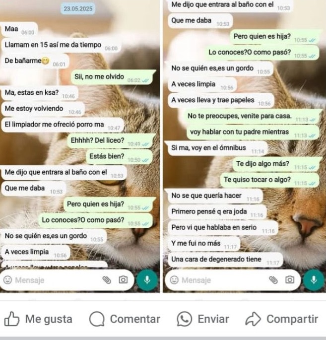 En el diálogo compartido, la madre le pregunta a su hija si conocía al funcionario en cuestión, a lo que la menor responde que sí, brindando detalles sobre sus características físicas para identificarlo. Visiblemente preocupada, la madre le ordena que vuelva de inmediato a su domicilio y le consulta si el hombre llegó a tocarla. Asimismo, menciona que hablaría de inmediato con el padre de la joven. En otra parte de la publicación, se afirma que ya se habría radicado una denuncia formal ante la justicia, lo que daría inicio a una investigación sobre lo ocurrido. El caso ha generado indignación en redes sociales y preocupación entre padres de estudiantes, que exigen una pronta respuesta de las autoridades educativas y judiciales para esclarecer los hechos y tomar las medidas correspondientes.