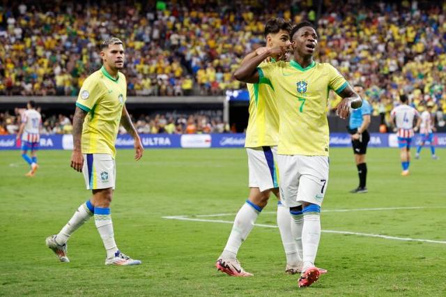 Goles: 35 y 45+5′ Vinicius Jr. (BR); 43′ Savinho (BR); 48′ Omar Alderete (P); 65′ Lucas Paquetá de penal (BR).
