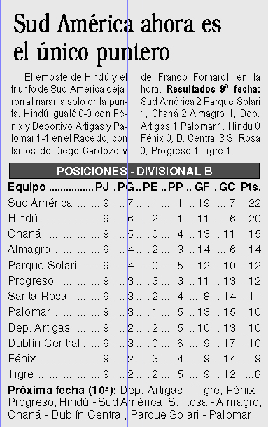 El empate de Hindú y el triunfo de Sud América dejaron al naranja solo en la punta. Hindú igualó 0-0 con Fénix y Deportivo Artigas y Palomar 1-1 en el Racedo, con tantos de Diego Cardozo y de Franco Fornaroli en la hora. Resultados 9ª fecha: Sud América 2 Parque Solari 1, Chaná 2 Almagro 1, Dep. Artigas 1 Palomar 1, Hindú 0 Fénix 0, D. Central 3 S. Rosa 0, Progreso 1 Tigre 1.
