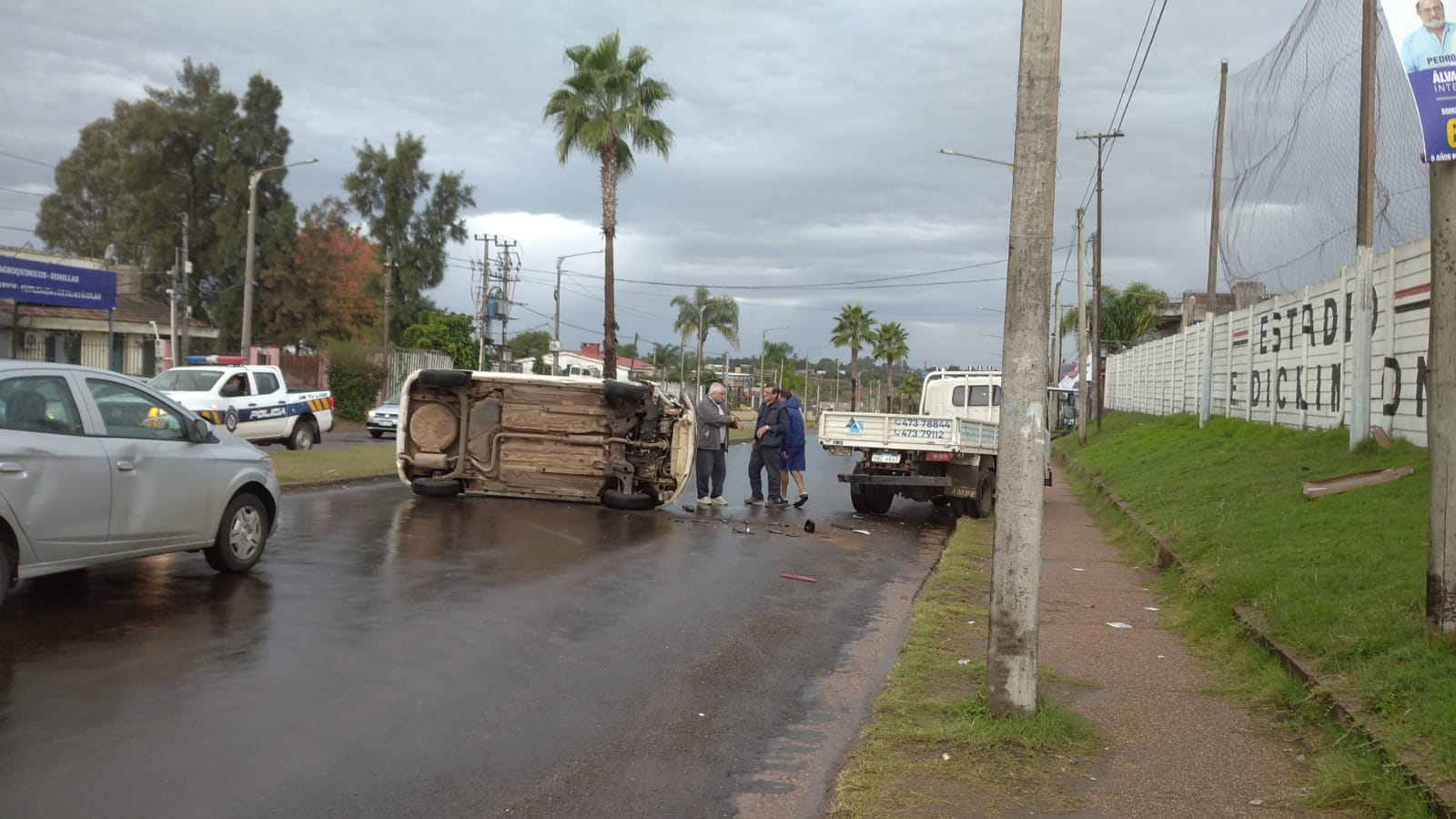 A la hora 15:40 de ayer se concurrió a la intersección de Avenida Manuel Oribe y Oficial Dos por un siniestro de tránsito. En el lugar se entrevistó con el conductor del auto VW Gol de 65 años de edad quien manifestó que circulaba por Avenida Manuel Orive al Oeste; en la intersección con Oficial Dos pierde el dominio de su vehículo, colisionando con un camión que se encontraba estacionado en la vía pública. Aunque volcó no resultó lesionado.