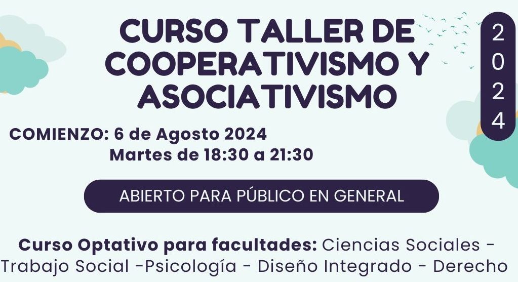 El equipo docente de la Unidad Regional de Extensión de la Universidad de la República, Cenur Litoral Norte, sede Salto, tenemos el agrado de invitar a una nueva edición del Curso Taller de Cooperativismo y Asociativismo, llevado a cabo desde el 2012 en nuestra sede universitaria. El mismo está dirigido al público en general, cuya temática que nos convoca sea de su interés, tanto para cooperativistas, como a profesionales que trabajen en el sector cooperativo y asociativo. También está dirigido a todos estudiantes del CENUR, siendo en este caso, un curso optativo para las carreras de Trabajo Social, Ciencias Sociales, Derecho, Psicología y Diseño Integrado, generando un total de 8 créditos.