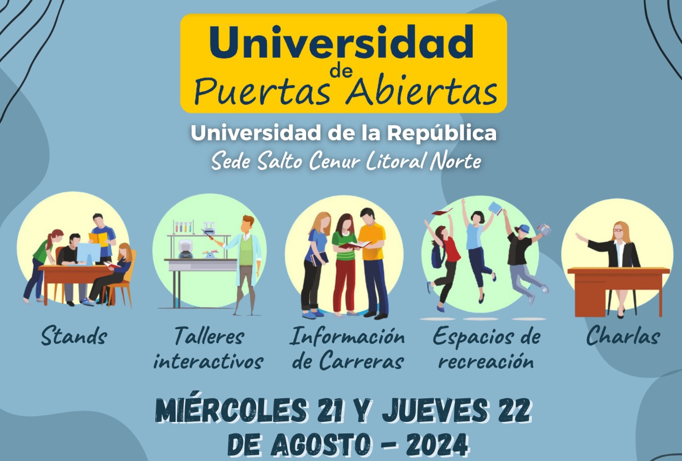 “Universidad de Puertas Abiertas” dispondrá de un Espacio Ferial en piso 0 en el edificio central de la sede Salto (Rivera esquina Misiones). Se realizarán Visitas guiadas a Plataforma de Investigaciones, así como charlas y talleres en el Aula Magna y otros salones. Donde se brindará información y orientación de carreras universitarias y aspectos que hacen a la vida universitaria, fundamentalmente a estudiantes de enseñanza media (Secundaria y UTU). Las jornadas se realizan con la colaboración en la organización de la Oficina de la Juventud de la Intendencia de Salto. Quienes estarán sumando un espacio de difusión de los servicios que presta la Intendencia: alojamiento, pases de ómnibus, comedor, biblioteca municipal, actividades recreativas y deportivas, entre otras. Por tal motivo se invita a estudiantes de 5to y 6to años de bachillerato de Liceos públicos y privados de Salto y la región y escuelas de UTU.