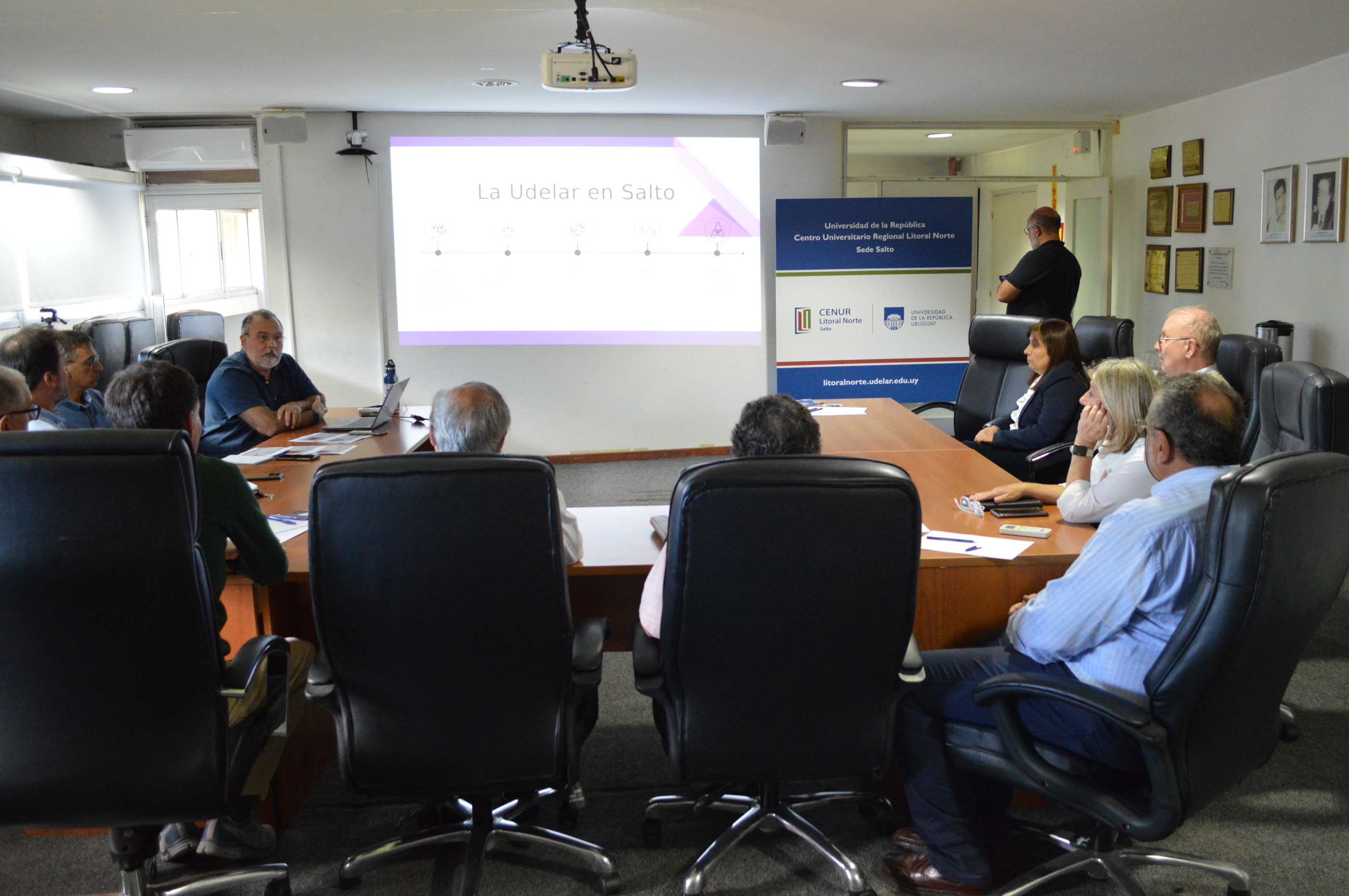 En primera instancia el Dr. Romero expuso sobre diferentes aspectos del desarrollo de la Universidad de la República en nuestro departamento con antecedentes con más de 100 años y desde el asentamiento en mayo de 1957, a nuestros días. Se aportó información actualizada sobre la oferta en enseñanza, el desarrollo en investigación y extensión universitaria, la infraestructura y equipamiento, la matrícula y el perfil estudiantil, y en segundo orden se abordaron diferentes temas que hacen al desarrollo universitario y en particular al intercambio entre la Udelar y la Intendencia de Salto, así como la consolidación del proyecto Salto Ciudad Universitaria.