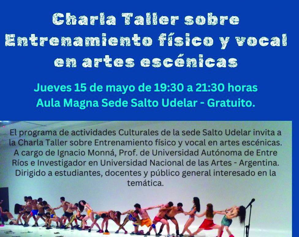 Desde el Programa de Actividades Culturales de la sede Salto del Cenur Litoral Norte de la Universidad de la República, se invita a la Charla Taller sobre “Entrenamiento físico y vocal en artes escénicas”. El mismo tendrá lugar el próximo jueves 15 de mayo de 19:30 a 21:30 horas en el Aula magna de la sede Salto Udelar. La Charla Taller sobre Entrenamiento físico y vocal en artes escénicas, será una primera instancia introductoria y a partir de la cual se planificarán dos encuentros taller. La misma estará a cargo de Ignacio Monná, Prof. de Universidad Autónoma de Entre Ríos (UADER) e Investigador en Universidad Nacional de las Artes de Argentina.