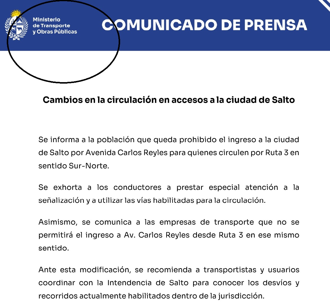 Un sorpresivo comunicado del Ministerio de Transporte y Obras Públicas (MTOP) -que llegó en la jornada de ayer jueves mediante correo electrónico- provocó el desconcierto entre autoridades y transportistas de Salto. En la misiva la secretaría de Estado informa la prohibición del ingreso a la ciudad por Avenida Carlos Reyles para quienes circulan por ruta 3 en sentido sur–norte. La nueva medida impacta especialmente a transportistas y viajeros que llegan desde el sur y encuentra a los responsables locales sin respuestas oficiales concretas.