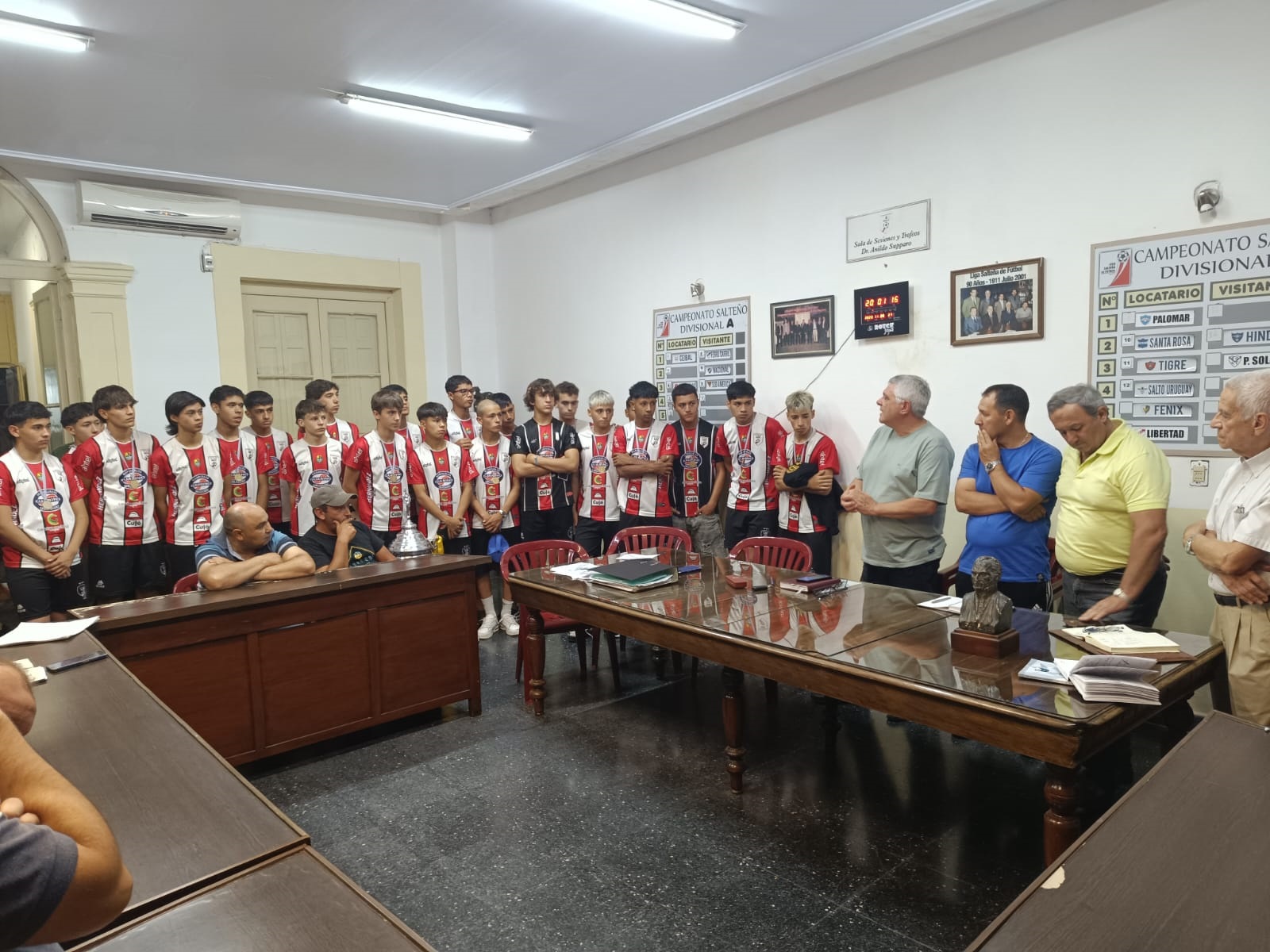 Se realizó un reconocimiento al plantel y cuerpo técnico de la selección de Salto sub 15, que obtuvo el pasado fin de semana en Maldonado la Copa Nacional de Selecciones de la Categoría. El presidente de la Liga Salteña, Luis Arreseigor, destacó no sólo el trabajo dentro de la cancha, sino también el comportamiento del plantel, que fue aplaudido por todos los presentes.