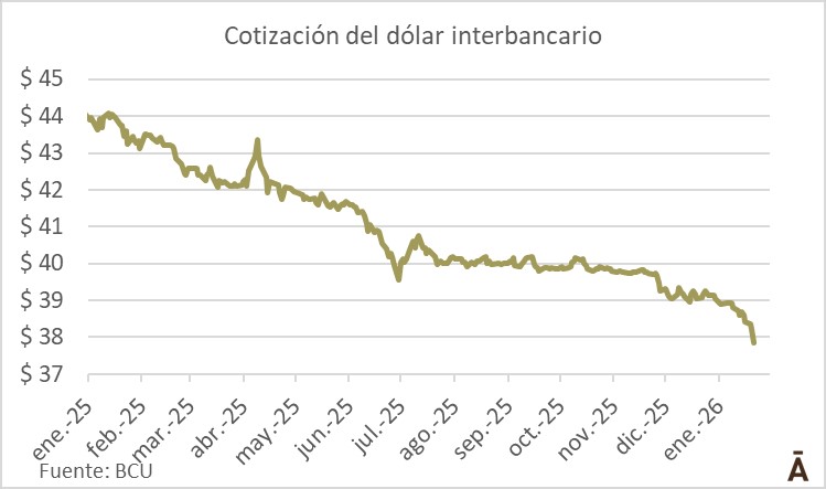 El dólar volvió a profundizar su debilidad frente al peso uruguayo y cayó este miércoles por debajo de los $ 38 en el mercado mayorista, un nivel que no se observaba desde marzo de 2024. La divisa cerró a $ 37,80 en Bevsa, con una baja diaria de 1%, acumulando un retroceso de 3% en lo que va de enero y de 12,2% en el último año móvil.