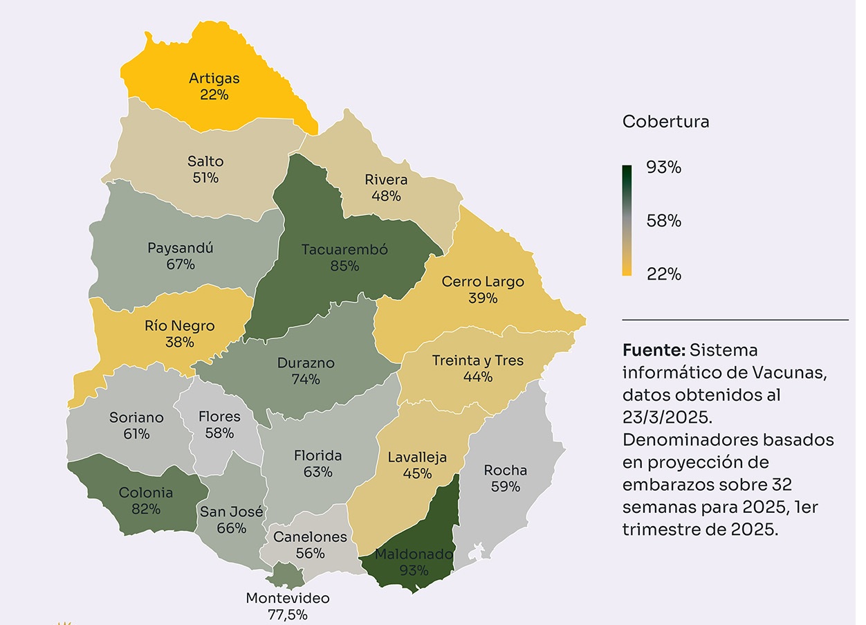 De acuerdo al monitor de inmunizaciones del MSP, el 51% de las dosis destinadas a las embarazadas en Salto fueron suministradas y se destaca la respuesta por ser uno de los departamentos que más dosis se aplicaron. La vacuna VRS es una inmunización pasiva destinada a embarazadas que se encuentren entre las 32 y 36 semanas + 6 días de gestación. Su propósito es transferir anticuerpos al feto, otorgando protección a los lactantes frente a infecciones graves por el Virus Sinicial Respiratorio (VRS) durante sus primeros seis meses de vida. Los pediatras piden a las madres en espera de dar a luz que acudan a esta vacuna para evitar que durante los meses de invierno los niños sufran consecuencias por este virus.