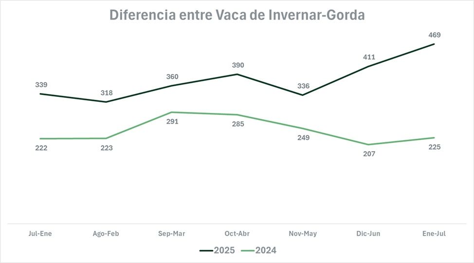 Entre los meses de enero y julio de este año, se observa que la diferencia entre el valor de compra de la vaca de invernar al bulto (180 días antes) y el de venta como gorda a frigorífico, ha venido mejorando en este período. De enero a mayo la diferencia ha subido un 3%, mientras que entre mayo y julio ha subido un 48%.