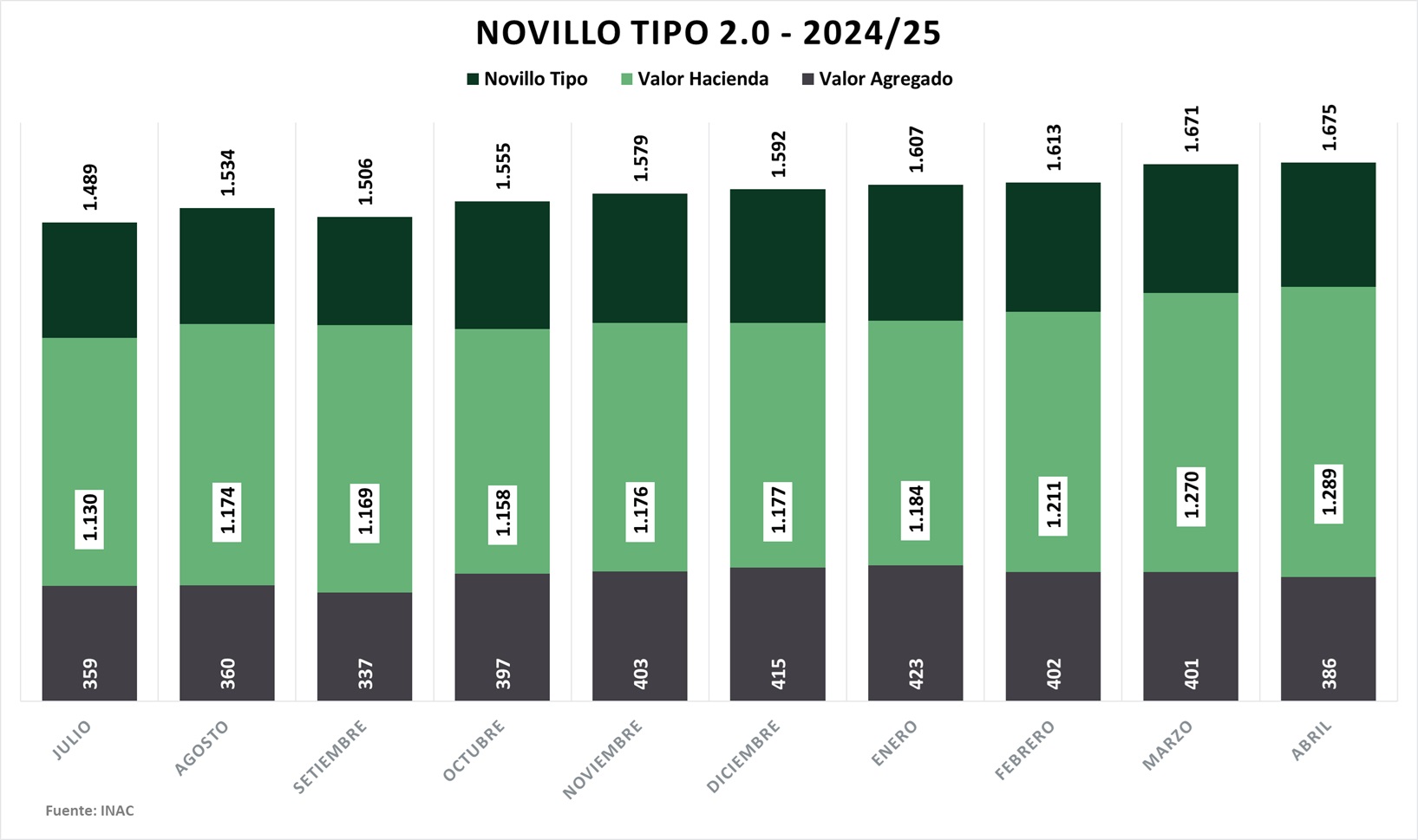 En el mes de abril el valor generado por la venta de todos los productos de un Novillo Tipo 2.0 (animal de razas británicas y sus cruzas, con 520 kilos en pie y 54% de rendimiento) luego del proceso industrial fue de US$ 1.675 por cabeza, lo que marca un incremento del 0,3% respecto al valor del mes de marzo (+US$ 4,00) y acumulando una suba del 11% desde que comenzó la secuencia alcista de forma consecutiva en setiembre de 2024.