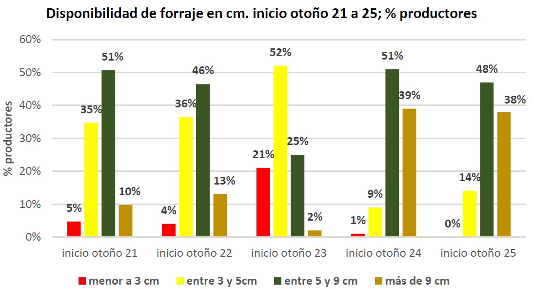 El informe señala que el 86% de los productores reporta disponibilidades de forraje superiores a los 5 cm y de buena calidad, registrándose por primera vez en más de cuatro años la ausencia de situaciones críticas por debajo de los 3 cm. Esta situación sitúa al inicio del otoño de 2025 como el segundo mejor de los últimos cinco años, solo superado por el 2024, pero considerablemente mejor que los inicios de otoño precedentes. En cuanto a las pasturas sembradas, 7 de cada 10 productores informan un estado bueno o muy bueno, aunque se observan diversas situaciones en los verdeos, desde aquellos ya en pastoreo hasta los aún sin sembrar.