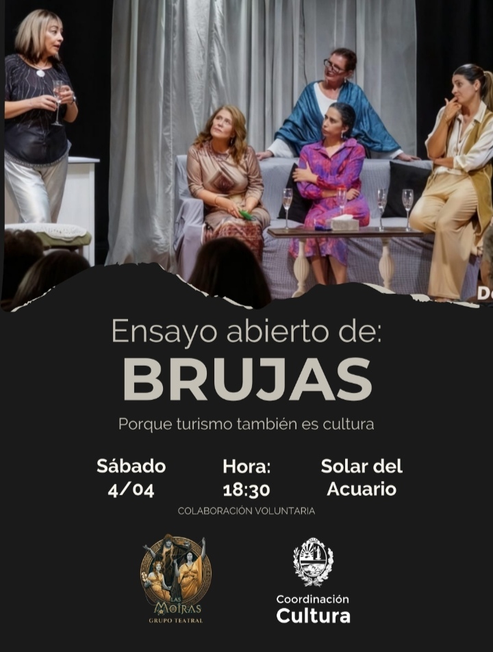 El próximo sábado 4 de abril a las 18:30 horas en el Solar de Acuario (Termas del Daymán) se llevará a cabo un ensayo abierto de la obra Brujas por parte del grupo teatral Las Moiras, la entrada es una colaboración voluntaria.