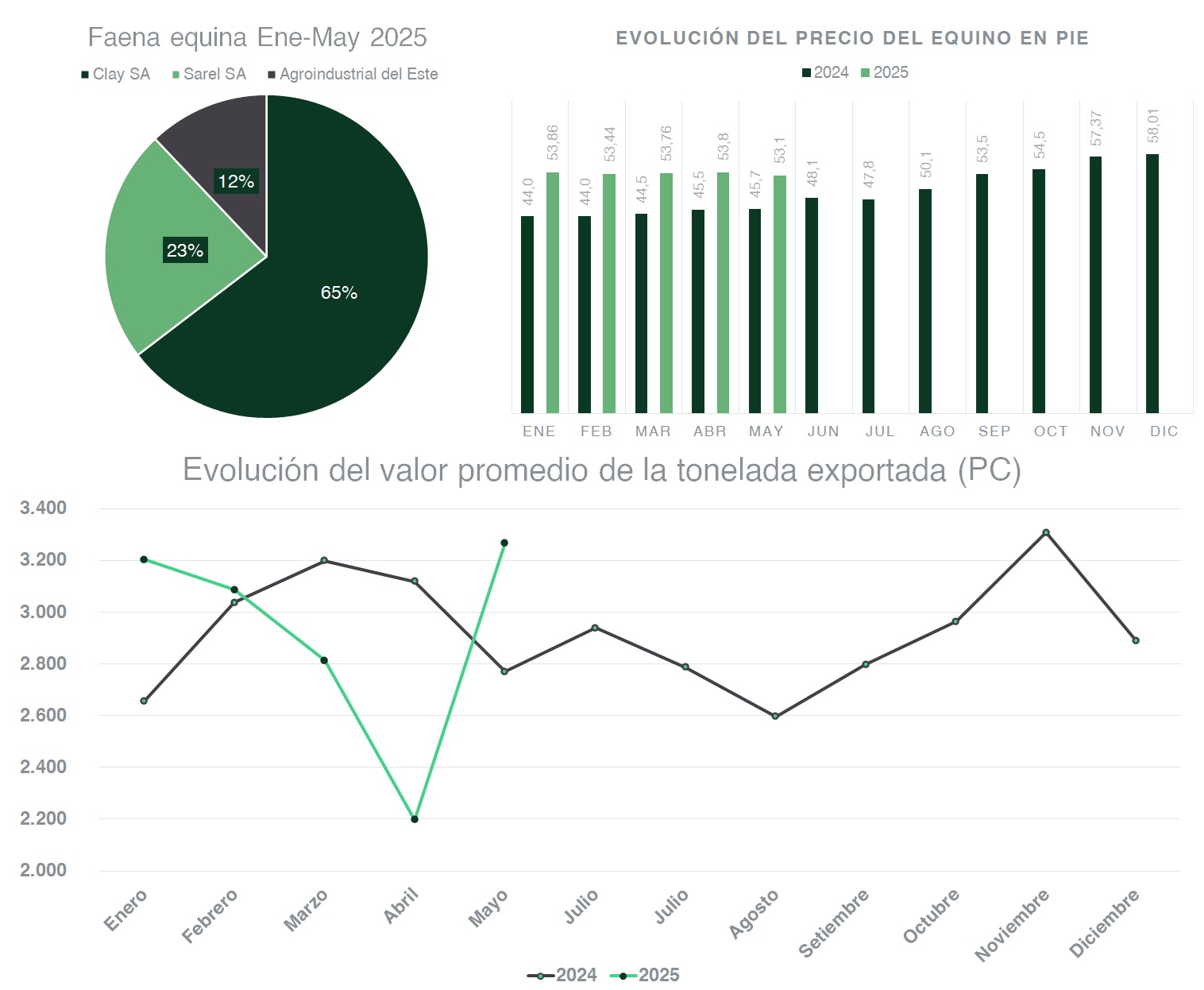 El valor promedio de exportación por tonelada fue de US$ 2.914, apenas 0,3% por debajo de los US$ 2.922 registrados en igual lapso de 2024. Esta leve caída en el precio internacional contrasta con el fortalecimiento del mercado interno, donde el precio del equino en pie para faena mostró una importante recuperación.
