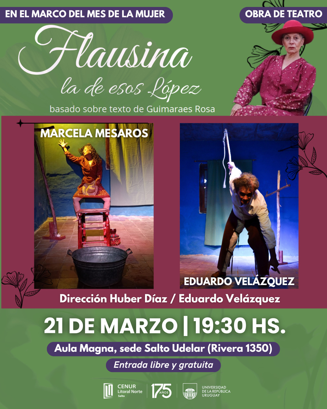 Mañana viernes 21 de marzo a las 19:30 horas se desarrollará en el marco de la agenda del mes de la mujer en Salto «Flausina la de esos López», en el Aula Magna de la Sede Salto – Cenur LN, con entrada libre y gratuita. Con la actuación de Marcela Mesaros y Eduardo Velázquez. Se trata de una obra teatral apta para mayores de 13 años, con la dirección escénica se encuentran Huber Díaz y Eduardo Velázquez.