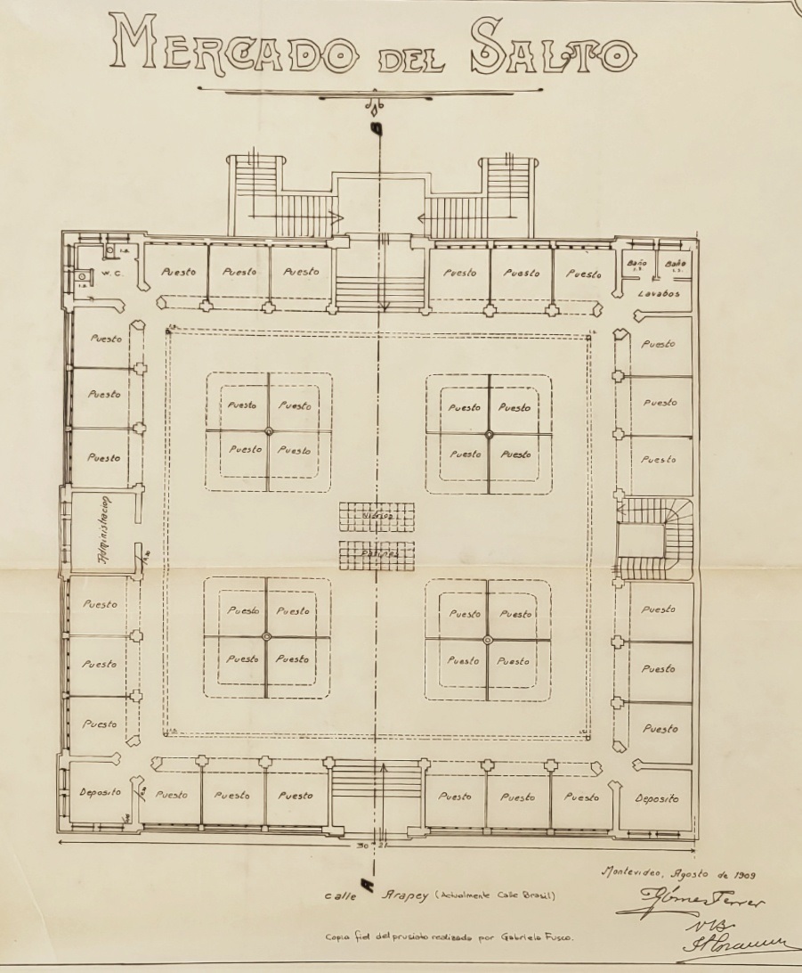 El mercado se organizaba en tres sectores bien definidos, pero uno de ellos conservaba la memoria de un tiempo anterior. En la parte posterior, la plaza empedrada —antiguo Corralón del Mercado de Salto (1868) — mantenía su función como espacio de acceso. Allí, bajo la sombra de los paraísos, ingresaban los carros por un portón hacia la calle 19 de Abril. En la planta superior se desarrollaba el mercado propiamente dicho, mientras que el subsuelo albergaba un mercado complementario.