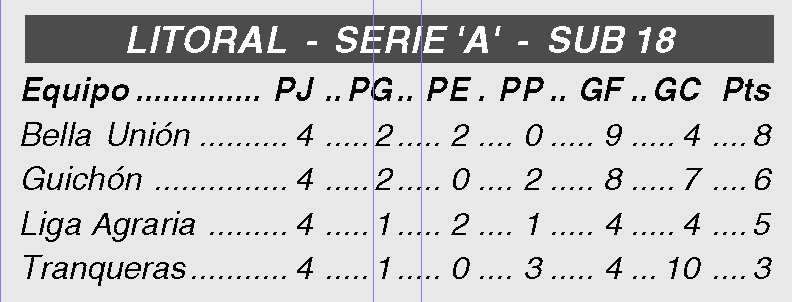 En el otro encuentro de la Serie A del Litoral en Juveniles, Guichón derrotó como local 3-0 a Tranqueras y con este resultado pasó al segundo puesto, desplazando a Liga Agraria al tercero, en tanto que Bella Unión sigue en el primer lugar y Tranqueras último.
