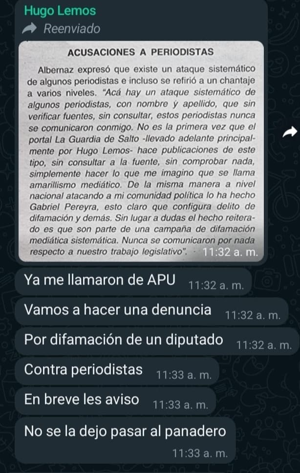 -El miércoles Albernaz habló en la mañana de Radio Salto, y tu “Diablo” director lo levantó en el diario. ¡¡¡No dejó títere con cabeza!!! Dijo que eso era mentira, y que era todo una operación de Cecilia Eguiluz. Que lo habían querido chantajear y que los periodistas Hugo Lemos y Gabriel Pereyra eran el brazo periodístico de toda esta operación.