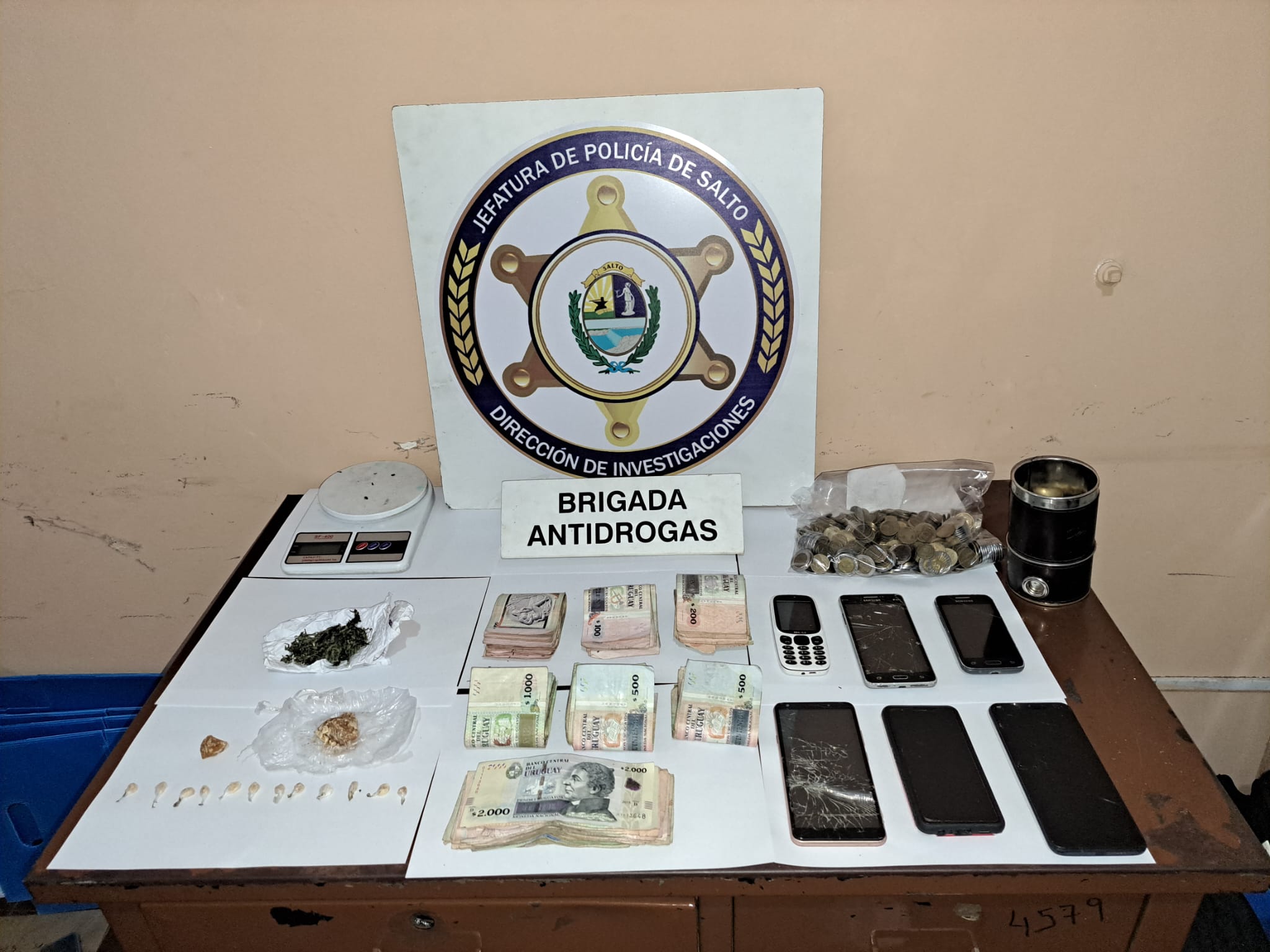 Ayer por la tarde, la Brigada Departamental Antidrogas con apoyo de unidades operativas e investigativas, procedieron a realizar una serie de allanamientos en tres hogares ubicados en zona de barrio Villa España, con órdenes impartidas por la justicia competente. Se detuvieron a cinco personas, (tres hombres y dos mujeres) y se logró incautar varios envoltorios de sustancia amarillenta compatible con pasta base, un envoltorio con sustancia vegetal compatible con marihuana, varios celulares, una balanza de precisión y dinero en efectivo, una suma total de 24.880 pesos uruguayos.