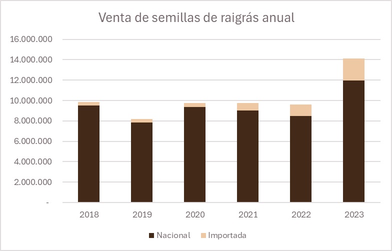 En nuestro país, mayormente la utilización de semillas de raigrás anual es de origen nacional, principalmente desde el 2017 año en que se debe utilizar semilla únicamente certificada de esta especie en el país. Según datos del Instituto Nacional de Semillas (INASE) la comercialización de semillas en el país rondaba entorno de los 9,4 millones de kilogramos promedio entre 2018 y 2021 (con sus altibajos), cifra muy similar a 2022, pero lejana de los 14 millones de kilos del año 2023.