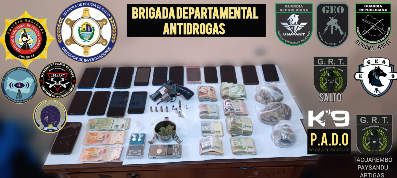 Participaron del operativo más de 250 efectivos de la Jefatura de Policía de Salto, conjuntamente con el apoyo de la Dirección Nacional de Guardia Republicana, Unidad Nacional de Vehículos Aéreos No tripulados (UNAVANT) y del Instituto Nacional de Rehabilitación (INR) como de otras jefaturas departamentales como lo son de las ciudad de Artigas, Paysandú, Rivera y Tacuarembó, logrando la detención de 19 personas (11 hombres y 8 mujeres, entre ellos dos menores y los restante mayores de edad respectivamente) y la incautación de: un revólver calibre 32 de procedencia Argentina, varias municiones, dos balanzas de precisión, celulares de diferente modelo y marca, dinero nacional y extranjero y sustancias prohibidas. Según informó el Vocero de Jefatura de Policía de Salto, Ruben de Souza, estas actuaciones son la continuación de la Operación Saturno llevada adelante en el mes de noviembre. Se seguirá actuando en combate al narcotráfico.