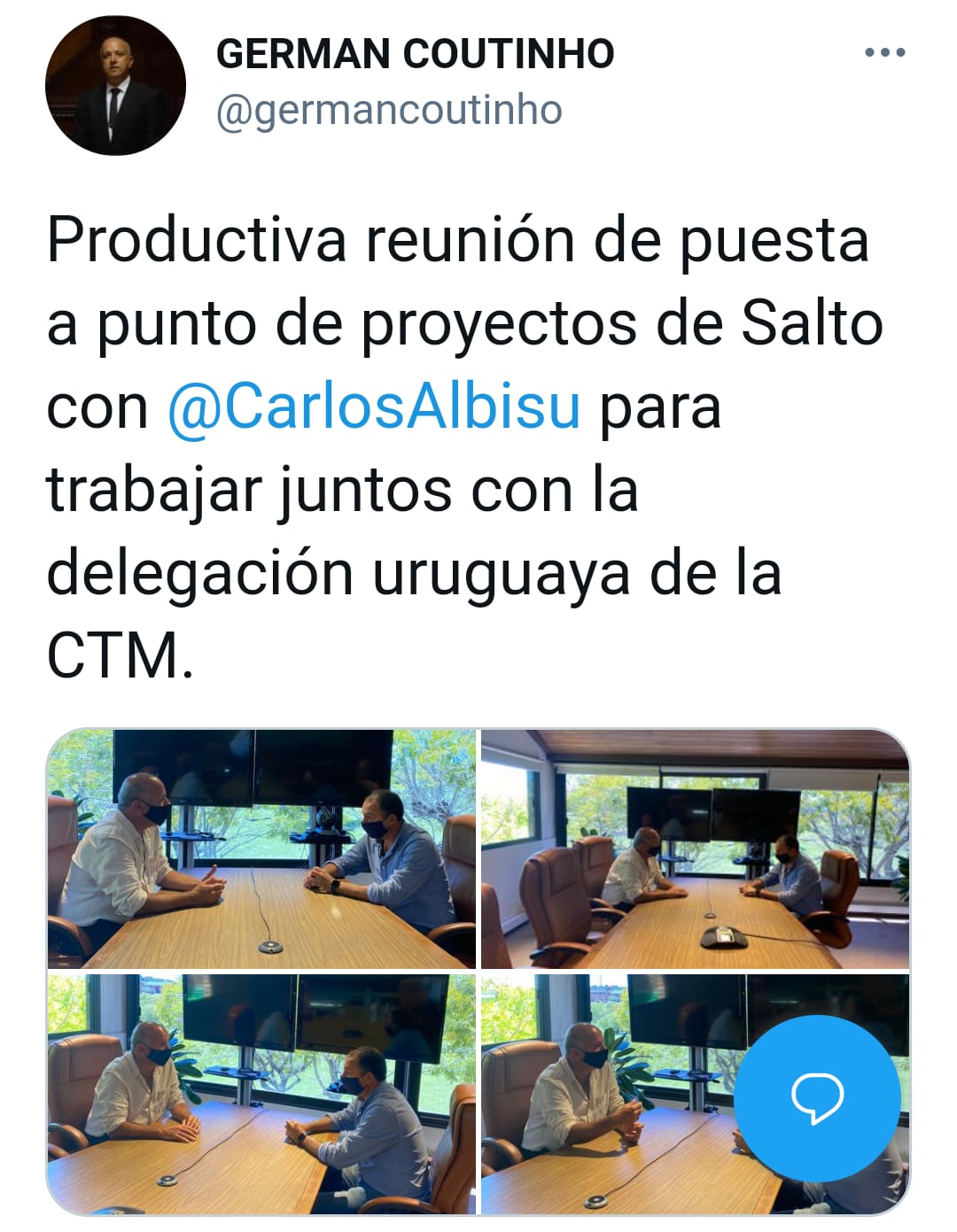 -Mirá, no sé a que te referís, pero bueno, no importa. Lo que quiero decir es que ahora que hablaste de la CTM, es válido comentar que el viernes, a pedido del senador Germán Coutinho, se reunieron Albisu y él, y como dijo en tuiter, para hacer una «puesta a punto de proyectos de Salto y trabajar juntos, con la delegación uruguaya de la CTM»