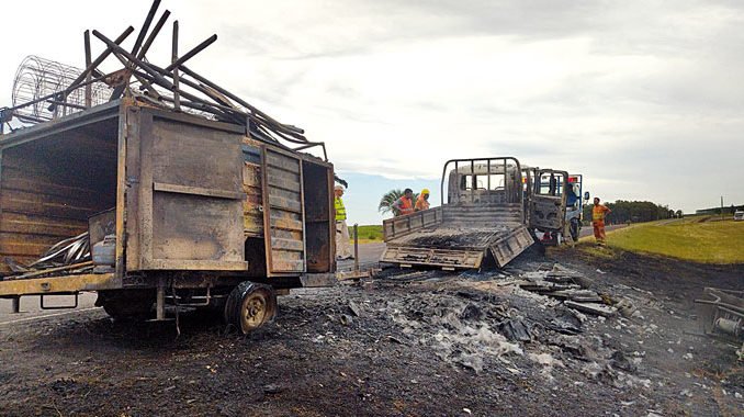 Circulaba por ruta 3 al norte un camión de pequeño porte, tirando un tráiler cargado con materiales de construcción. Según información obtenida en el kilómetro 436 el chofer del rodado -a quien acompañaba otra persona-después de sentir fuerte olor a gasoil detuvo el vehículo. De inmediato tomó fuego, tornándose incontrolable incluso su desplazamiento al tráiler, donde entre otros elementos llevaban tres garrafas, pero que no hicieron explosión. La llegada de bomberos desde Paysandú permitió extinguir el fuego y sobre todo impedir que se propagara por el campo. Las pérdidas de los vehículos siniestrados son totales y tanto el chofer como su acompañante resultaron ilesos.