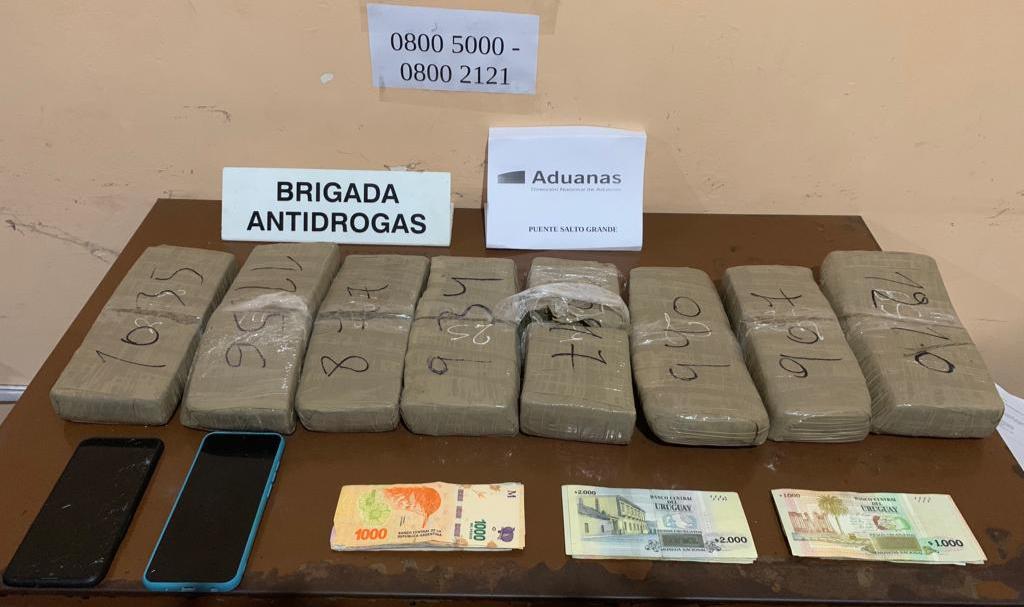 La información oficial proporcionada por Jefatura de Policía de Salto da cuenta que a la hora 21:35 aproximadamente Personal de Aduana del Paso de Frontera Concordia – Salto (puente Salto Grande) procedieron a realizar inspección en una camioneta Chevrolet Corsa pick up, matriculada en Salto, donde en un compartimento oculto detrás del asiento transportaban 8 ladrillos de sustancia vegetal. Por Disposición de Fiscalia de Turno del Departamento asumió el procedimiento la Brigada Departamental Antidrogas y se procedió a la detención de una mujer de 35 años de edad y un hombre de 59 años de edad.
