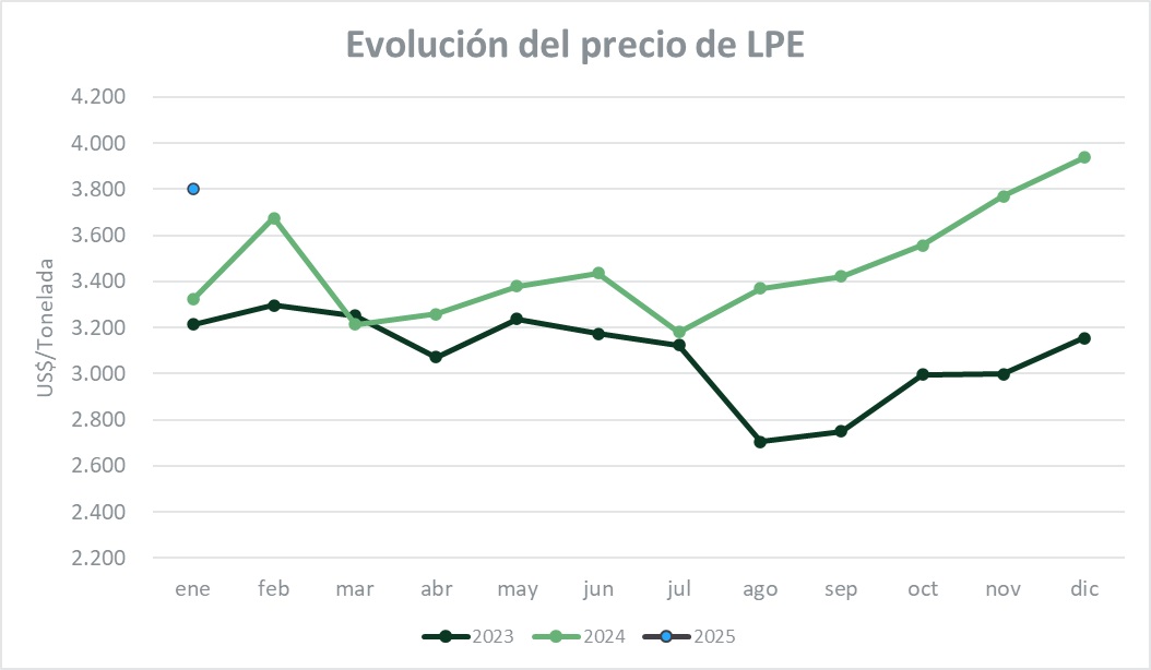 Los contratos de LPE a futuro cerraron con descensos en todas las posiciones. Los negocios de marzo y abril, que son los de mayor volumen comercializado (71%), se posicionaron en US$ 3.788 y US$ 3.784 por tonelada con bajas del 2,1% y 2,5%.