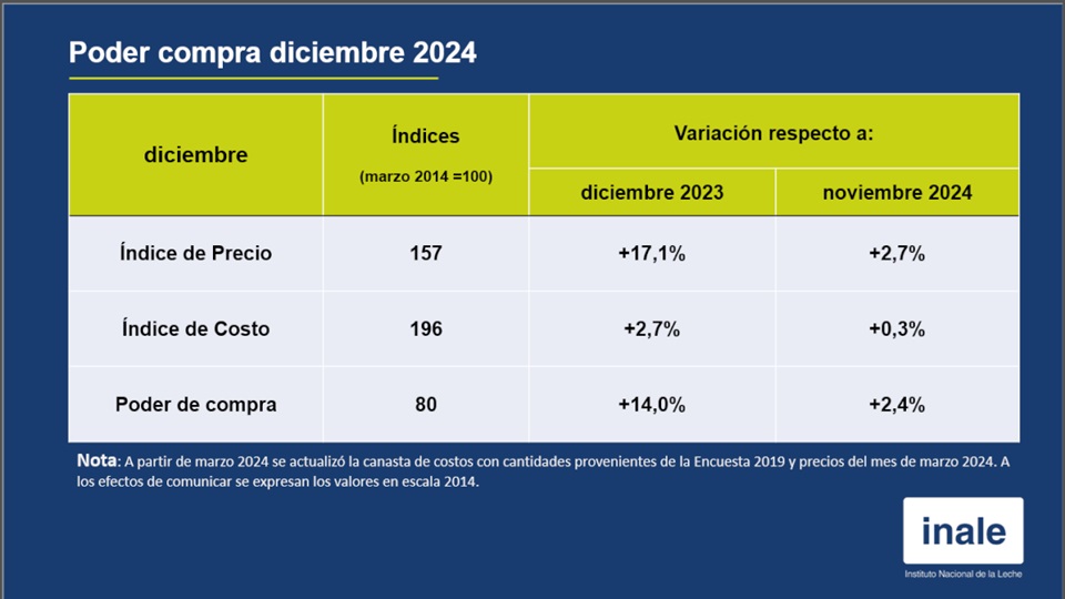 El Instituto Nacional de la Leche (INALE) publicó su informe sobre el poder de compra de la leche, correspondiente a diciembre de 2024, donde se registra incrementos tanto frente a noviembre, como al mismo mes del año anterior. Este aumento se vio limitado por un incremento de los costos entre años.