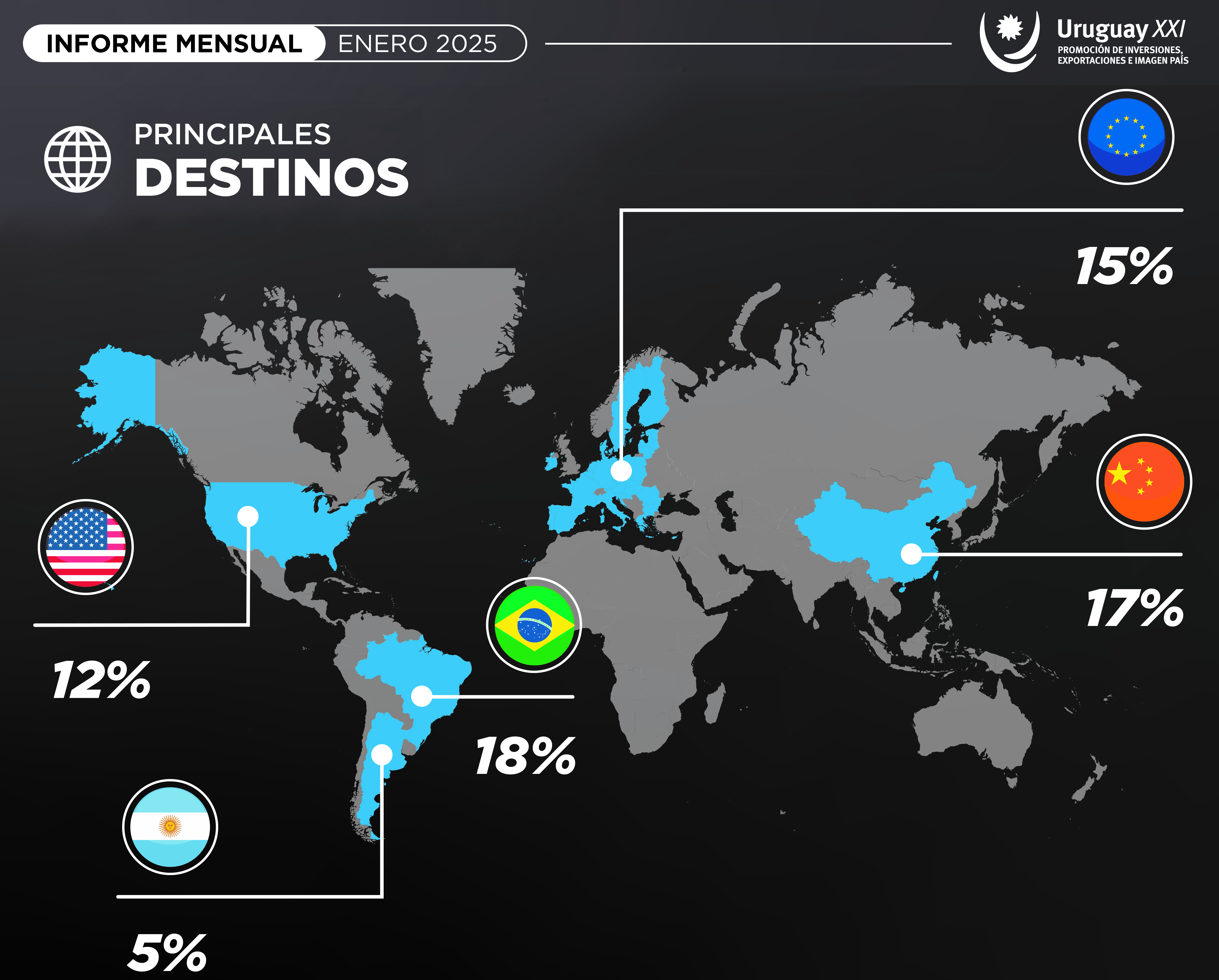 El desempeño de las exportaciones se destacó en un contexto donde Brasil se mantuvo como el principal destino de los productos uruguayos, absorbiendo el 18 % del total exportado. Sin embargo, las ventas hacia el vecino país registraron una contracción del 6 % respecto a enero de 2024, lo que muestra una leve desaceleración en ese mercado.
