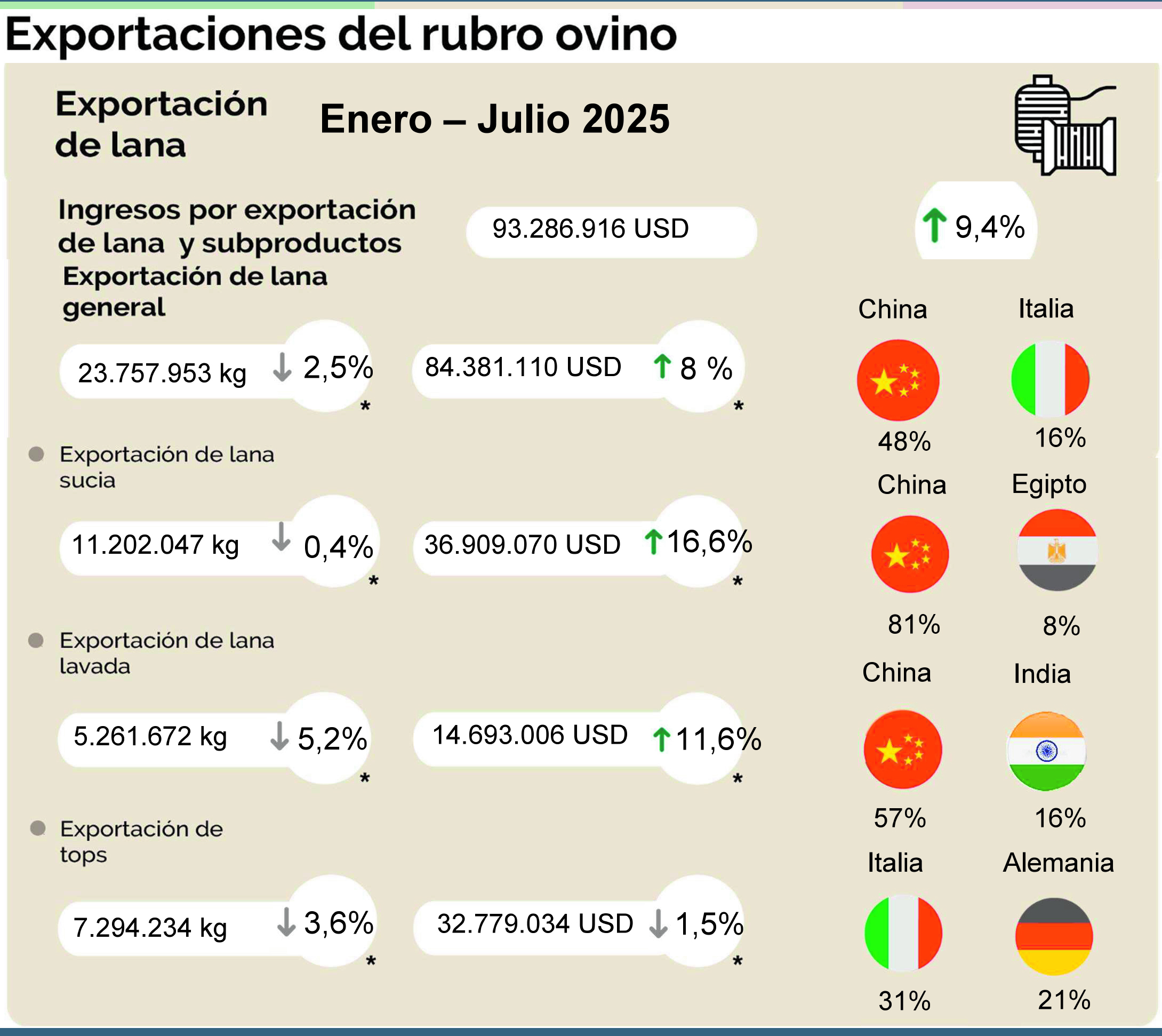Según el informe elaborado por el Secretariado Uruguayo de la Lana (SUL) en base a datos de la Dirección Nacional de Aduanas, las exportaciones totales del rubro ovino uruguayo -considerando lana sucia, lavada, peinada, tops, carne ovina y subproductos- alcanzaron los US$ 131 millones entre enero y julio de 2025. Esta cifra representa un incremento del 6% respecto al mismo período de 2024.