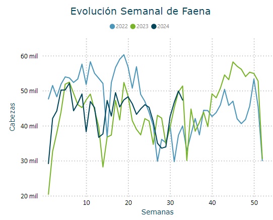 La faena vacuna estuvo compuesta por 21.497 novillos (-4%), 11.896 vacas (-11,5%), 7.261 vaquillonas (+2,1%) y se complementa con terneros y toros. En el acumulado hasta el 17 de agosto de 2024, la faena se posiciona en 1.448.511 cabezas, un 4,9% más que igual período del año pasado. Los novillos suman 731.902 cabezas (+6,6%), las vacas 507.657 (+5,7%) y las vaquillonas descendieron un 2,3% a 182.556 animales.