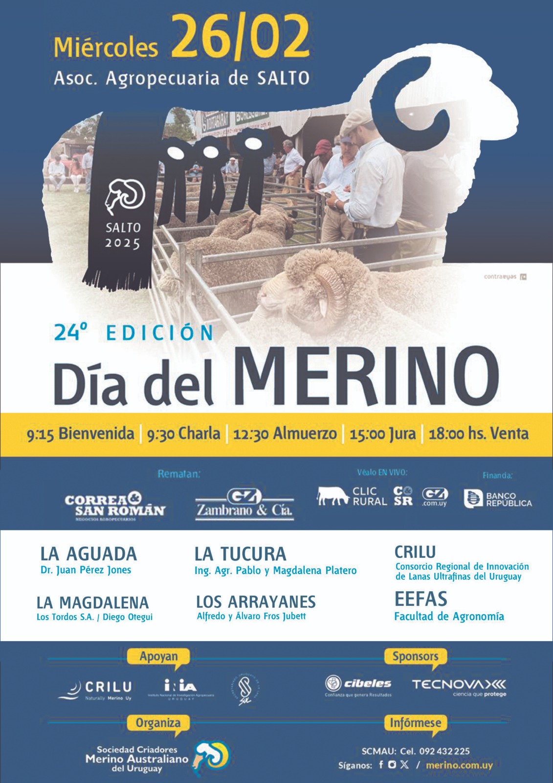En la jornada de hoy miércoles 26 de febrero, la Asociación Agropecuaria de Salto será el escenario de la 24ª Edición del Día del Merino, un evento que congrega a productores, técnicos y referentes de la industria ovina para compartir conocimientos y experiencias.