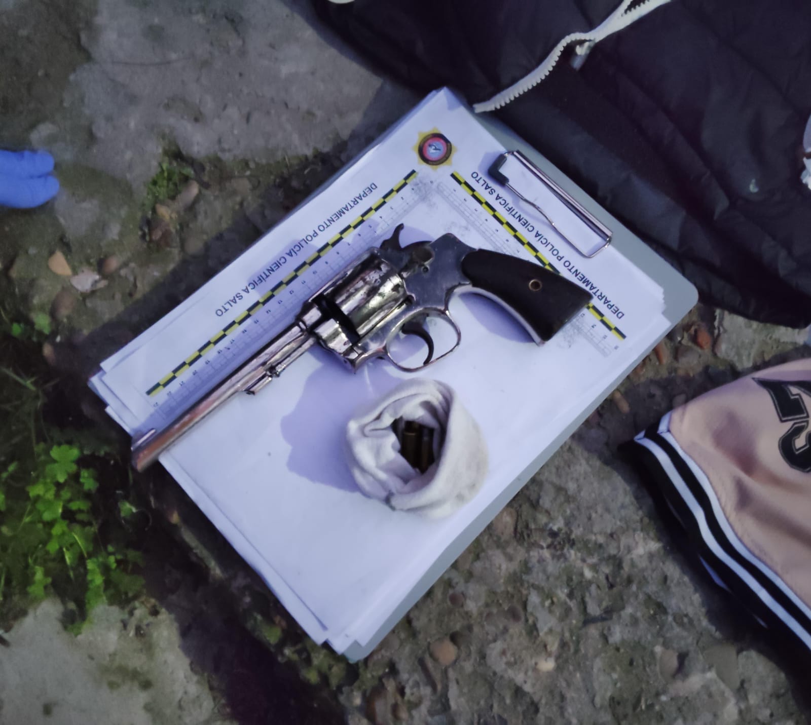 Testigos en el lugar señalaron como autor a un individuo que circulaba en moto, quien efectuó un disparo y huyó. Ese mismo día tras directivas del Fiscal y muñidos de la orden correspondiente se realizo un allanamiento en una casa, donde se pudo ubicar la moto, el casco, prendas de vestir y un arma de fuego, todo lo cual se pudo determinar que fue utilizado por el autor, sin lograr su detención. Continuando con las actuaciones personal de la Dirección de Investigaciones de la Jefatura de Policía de Salto los días viernes, sábado, domingo y lunes montó diferentes operativos con el apoyo de personal del Grupo de Reserva Táctica (GRT), personal de PADO (Programa de Alta dedicación Operativa), personal de la Brigada Departamental de Seguridad Rural (BDSR), personal y recursos logisticos de la Dirección General de Centro de Comando Unificado del Ministerio del Interior, personal de la Dirección Nacional de Guardia Republicana y de Prefectura de Salto en distintos barrios y zonas de la ciudad.