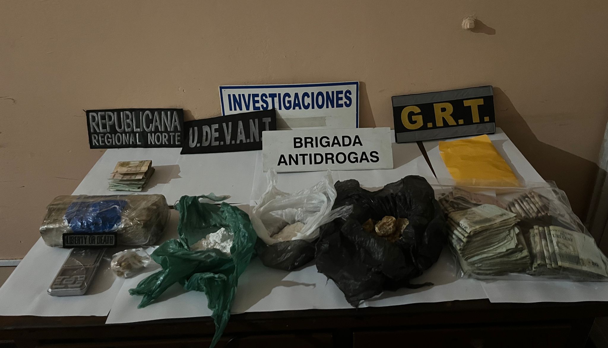 En el marco del Operativo Impacto, que se viene desarrollando en diferentes zonas de nuestro departamento y en el que participan varias unidades de la Jefatura de Policía de Salto, Guardia Republicana, con colaboración de la Intendencia de Salto, el viernes a la hora 19:50 cuando se realizaba un puesto de control en avenida Manuel Patulé y calle Ituzaingó, se procedió a la identificación de un ómnibus marca Volvo modelo B58 con matrícula de Salto, el cual transportaba trabajadores zafrales de la cosecha de naranja, donde una vez realizada la una inspección ocular en su interior, se localizó una mochila la cual contenía un paquete envoltorio tipo ladrillo con sustancia similar a pasta base, y otros envoltorios pequeños con sustancia similar, otro con sustancia compatible con cocaína, así como también dinero uruguayo en billetes de baja denominación. En el lugar se informó a Fiscalía quien dispuso relevamiento por parte de Policía Científica, que se transporte el vehículo y a todos los pasajeros a Brigada Departamental Antidrogas para que se les realice actas acuerdo al Artículo Nº 61 del C.P.P., actas a funcionarios policiales actuantes.