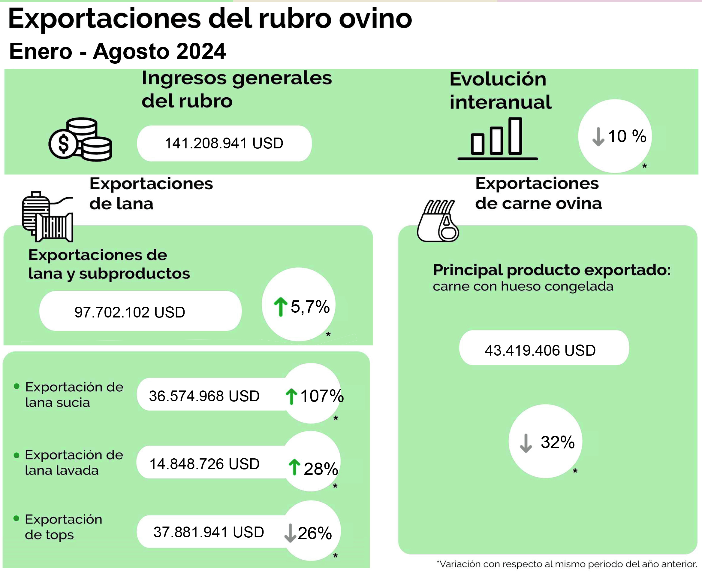 El sector de la lana experimentó un crecimiento notable en términos de volumen, con un aumento del 49% en la exportación de lana equivalente base sucia, alcanzando los 28,1 millones de kilos entre enero y agosto de 2024.