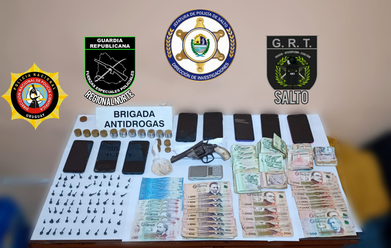 Durante la tarde del lunes, personal de la Brigada Departamental Antidrogas en conjunto con personal de Investigaciones, apoyado del Grupo de Reserva Táctica y Guardia Republicana, realizaron varios allanamientos en combate con el microtráfico de drogas en barrios de la zona sur de la ciudad. En los allanamientos encontraron una media con 70 envoltorios de pasta base (chasquis) prontos para la venta, una piedra de la misma sustancia que pesaba 65 gramos aproximadamente, la suma de 14.043 pesos uruguayos, un revólver sin marca calibre 32, una balanza de precisión y ocho celulares. Las actuaciones finalizaron con cinco detenidos que se encontraban en el lugar. Estas personas detenidas serás conducidas a Fiscalía en las próximas horas.