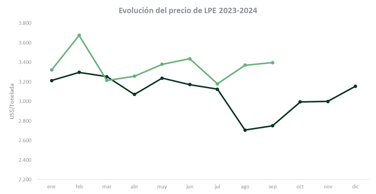 Los contratos de LPE a futuro cerraron todos en baja, con descensos del 2,7% y 3% en los contratos de noviembre y diciembre, en tanto que los contratos a febrero de 2025 cerraron un 1,9% a la baja.