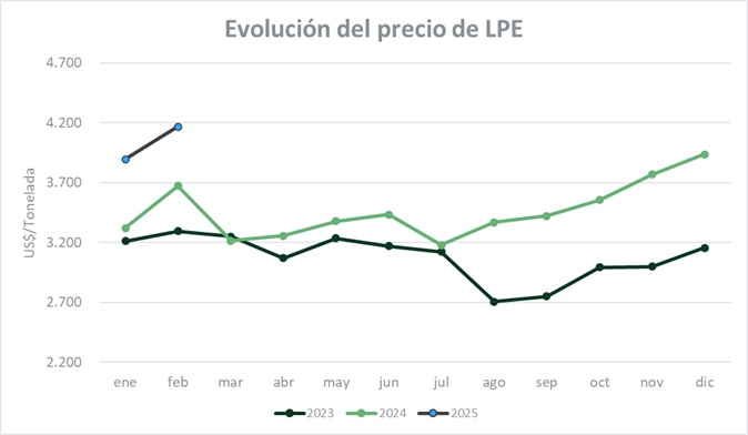 El volumen comercializado de este producto fue de 10.990 toneladas, 11,1% menos que la licitación previa, siendo los oferentes Solarec y Fonterra. Los contratos de LPE a futuro cerraron con subas en todas las posiciones, entre marzo y julio de 2025. Los negocios de abril y mayo, que son los de mayor volumen comercializado (suman el 73%), se posicionaron en US$ 4.147 por tonelada con subas del 4% y US$ 4.178 con aumento del 3,8%, respectivamente.