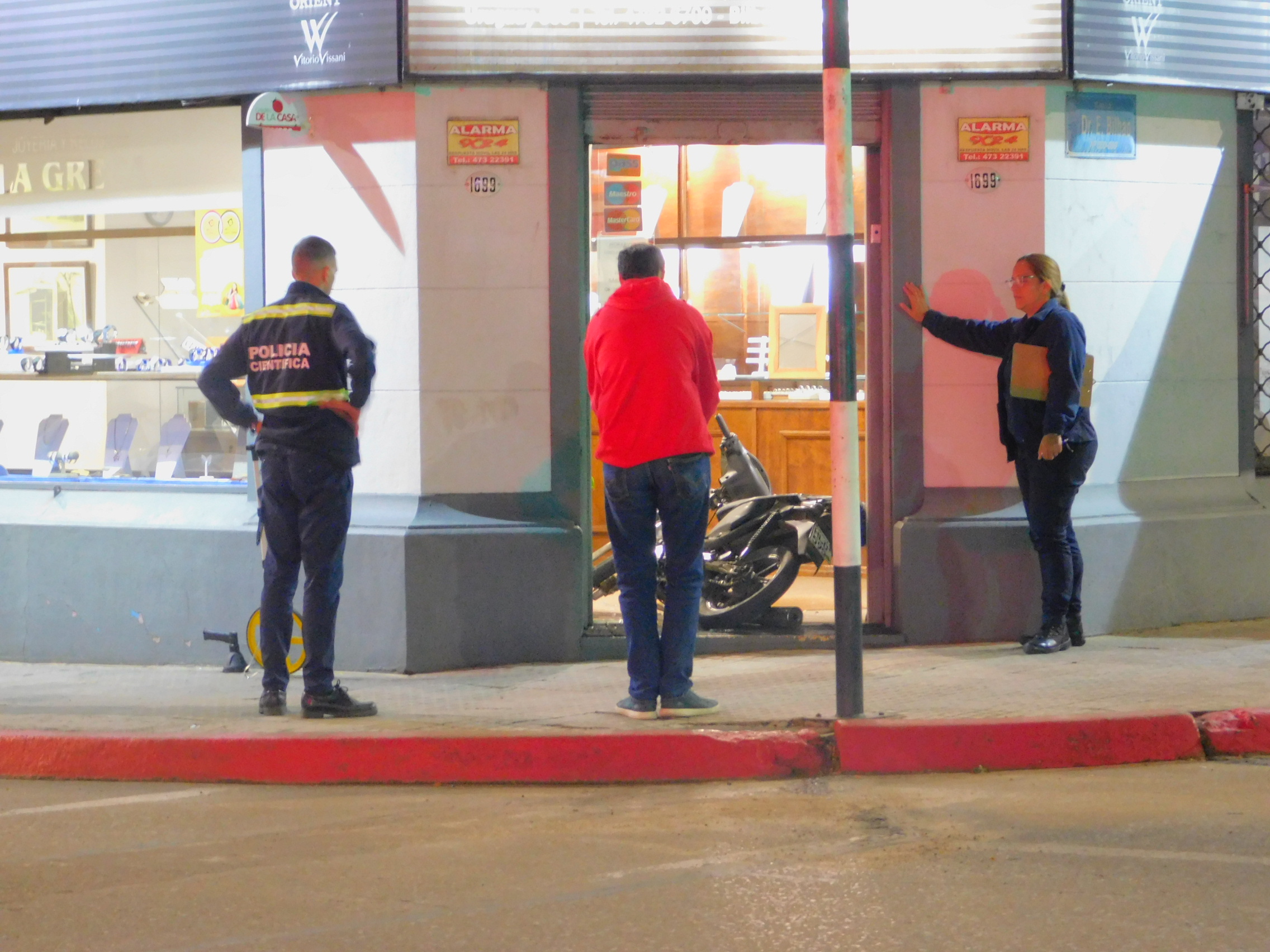 Alrededor de las 19:30 horas de la tarde de ayer, se produjo un siniestro de tránsito entre una motocicleta y una camioneta en la esquina de calle Uruguay y Bilbao. Según información de fuente confiable de CAMBIO, un motociclista ingresó al local de Joyería La Greca, generando daños en su puerta principal tras un siniestro de tránsito. Aparentemente la motocicleta se incendió, y el conductor sufrió lesiones. Consultado el Vocero de Jefatura de Policía de Salto, Ruben de Souza, informó de manera primaria, que todo ocurrió debido a un siniestro de tránsito entre la moto y una camioneta, donde el motociclista intentó rebasar al vehículo que circulaba en la misma dirección por calle Uruguay, enganchó el espejo del mismo y perdió el dominio del birrodado, ingresando a la joyería rompiendo la puerta blindex. Además, informó que el motociclista fue trasladado por una unidad médica con diagnóstico primaria “traumatismo cerrado de tórax”. El conductor de 42 años de la camioneta marca Renault, resultó ileso.