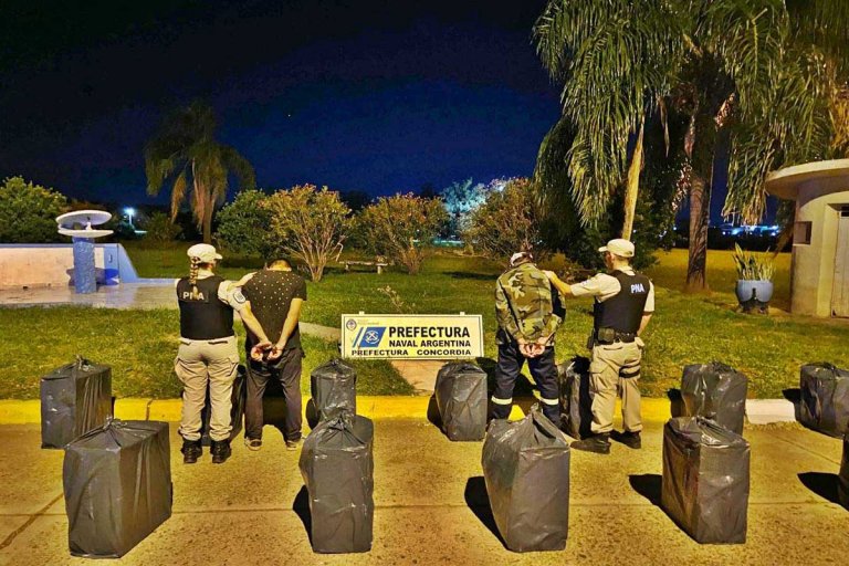 En un procedimiento realizado en Concordia, personal de la Prefectura Naval Argentina decomisó un cargamento de 24.000 atados de cigarrillos y mercadería de origen ilegal. Además, detuvo a dos involucrados. Según pudo saber Diario Río Uruguay, todo ocurrió cuando una patrulla de la fuerza, que realizaba tareas de control en el Paraje “El Boyero” ubicado a la altura del kilómetro 328,6 del río Uruguay, visualizó a dos personas sobre la costa en actitud sospechosa. Los malvivientes se disponían a cargar bultos desde un carro con tracción a sangre a un bote de chapa con motor para luego cruzar de manera ilegal con destino al Uruguay. Desde Prefectura se detalló que, de inmediato, se desplazaron al lugar medios fluviales y terrestres que realizaron un sistema de cerrojo, brindaron apoyo y seguridad en la zona, logrando aprehender a dos hombres. En ese momento, se constató que la carga consistía en 2.400 cartones de cigarrillos y productos para el cuidado del cabello. La mercadería fue secuestrada, junto con los medios empleados para cometer el ilícito y un celular. Por orden del Juzgado Federal de Concordia, a cargo de la Dra. Analía Ramponi, los dos involucrados quedaron detenidos. Según se calculó, el valor de todo lo decomisado supera los 27 millones de pesos.