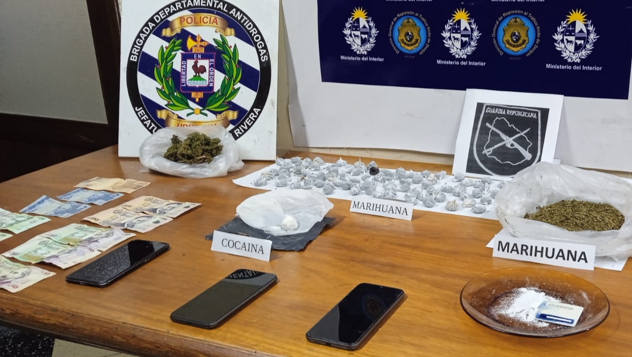 Con la autorización del Juez Letrado de 2° Turno y apoyo de la Guardia Republicana, personal del K9 y Policía Científica, personal de la Brigada Departamental Antidrogas y Delegación Rivera de la Dirección General de Represión al Tráfico Ilícito de Drogas allanaron la vivienda donde se incautaron 89 envoltorios con marihuana, 158 gramos de marihuana distribuidas en varios frascos, un envoltorio con 11 gramos de cocaína, un plato con residuos de polvo blanco, 3 celulares, 410 pesos y 54 reales.