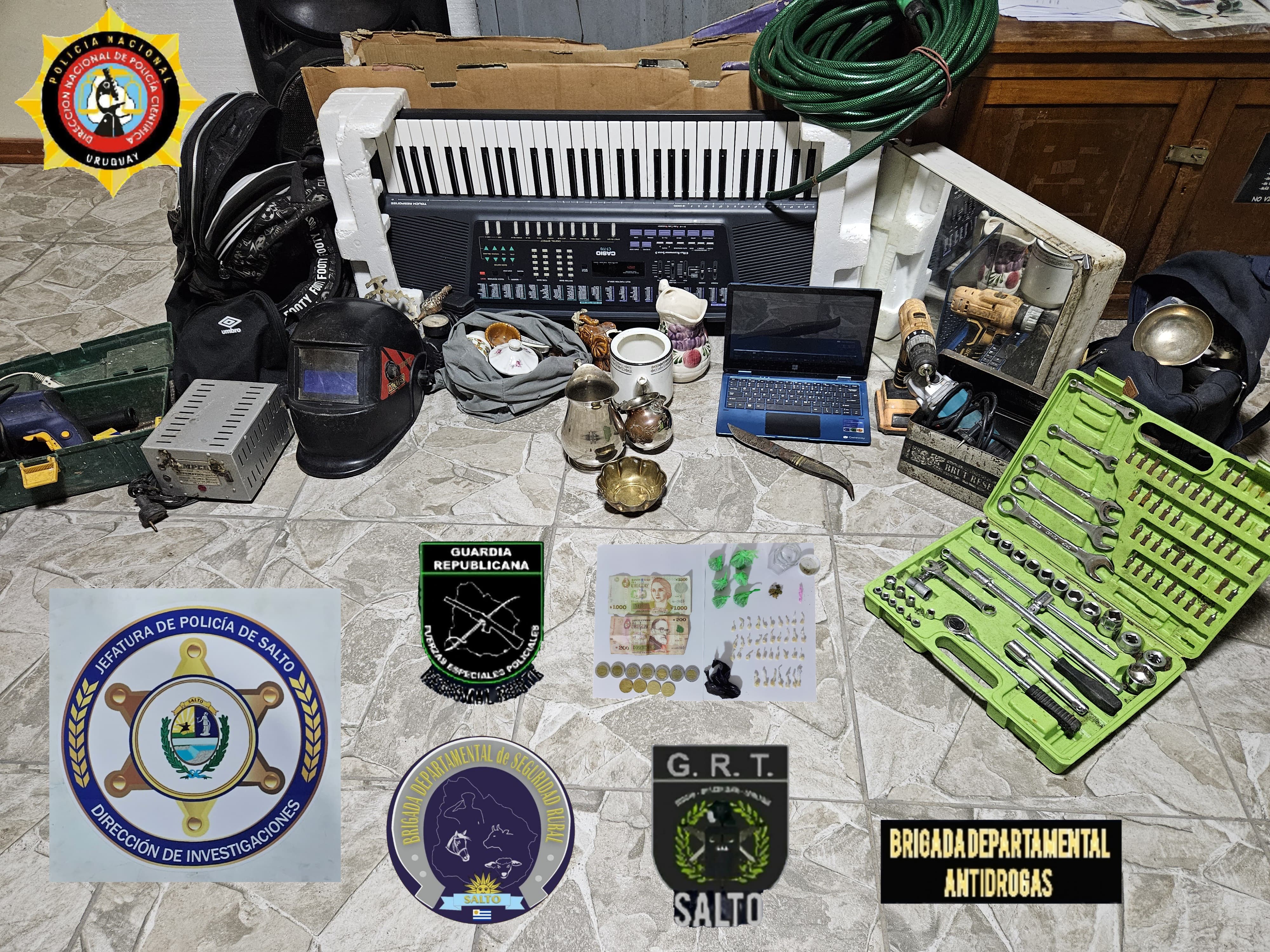 Alli se procedió a la detención de 3 hombres y una mujer, así como también a la conducción de 1 hombre y 1 mujer, a su vez se logró la incautación de objetos que serían producto de hurto, siendo estos los siguientes: Teléfonos celulares diferentes marcas y modelos. 1 Teclado marca Casio modelo CT-770. Varias herramientas eléctricas. Una caja de llaves de tubo marca Kroner. Un botiquin con espejo color blanco. Una Tablet del plan Ceibal color azul. Una manguera verde. Una máscara de soldar marca Otimatic. Un compresor chico color negro. Objetos antiguos (cuchara, cuchillos, platos vasijas, etc. Portones y planchuelas de dos hojas. Se documentó todo por Policía Científica y se enteró a la fiscal del caso.