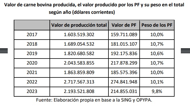 Particularmente, en el área ganadera, determinó que el universo de productores familiares es de 10.808 en el año 2023, lo que representa el 29% del total de los productores ganaderos declarados en Dicose. En tanto que en el período analizado los productores familiares representan el 30%.