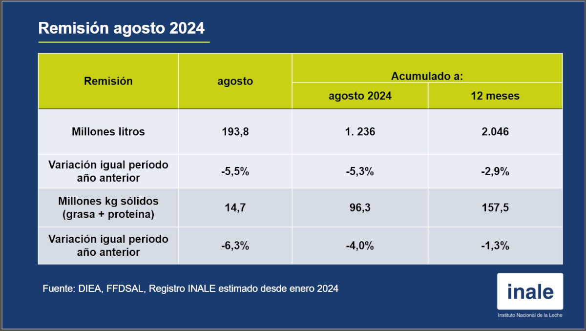 En agosto, la remisión de leche a las plantas industriales en Uruguay totalizó 194 millones de litros, registrando una disminución del 5,5% en comparación con el mismo mes del año pasado. A pesar de esta baja, se observa una moderación en comparación con los descensos de más de dos dígitos que se reportaron durante el trimestre mayo-julio. Sin embargo, los sólidos lácteos (grasa y proteína) tuvieron una caída mayor del 6,3%, alcanzando los 14,7 millones de litros, lo que revirtió la tendencia observada en los meses anteriores del otoño e invierno.