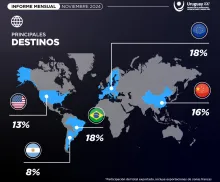En noviembre de 2024, las exportaciones de bienes uruguayos, incluidas las zonas francas, alcanzaron los 1.025 millones de dólares, marcando un incremento interanual del 5 %.
